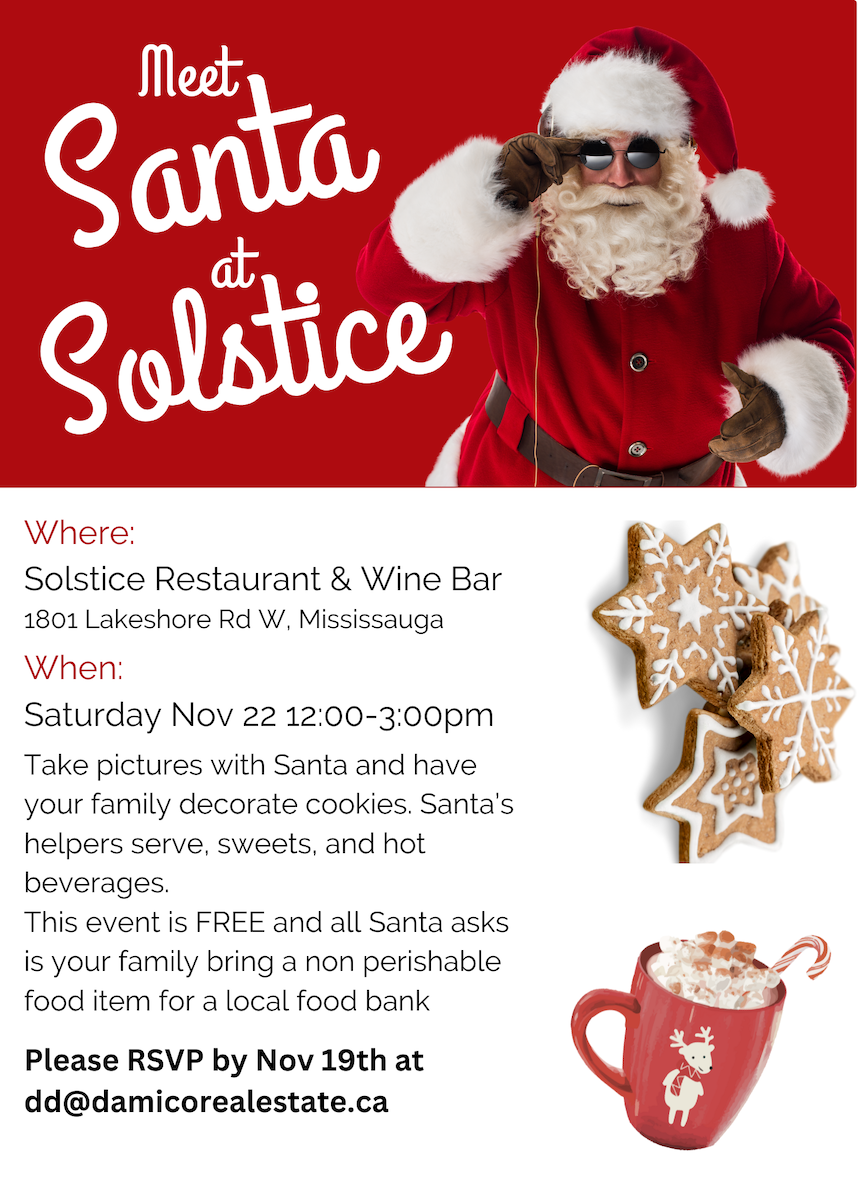 We’re excited to invite you to our Annual Santa, Prosecco & Pizza Party, happening tomorrow, Saturday, November 22nd, from 12 PM to 3 PM at Solstice Restaurant & Wine Bar in Clarkson Village (1801 Lakeshore Rd W, Mississauga).