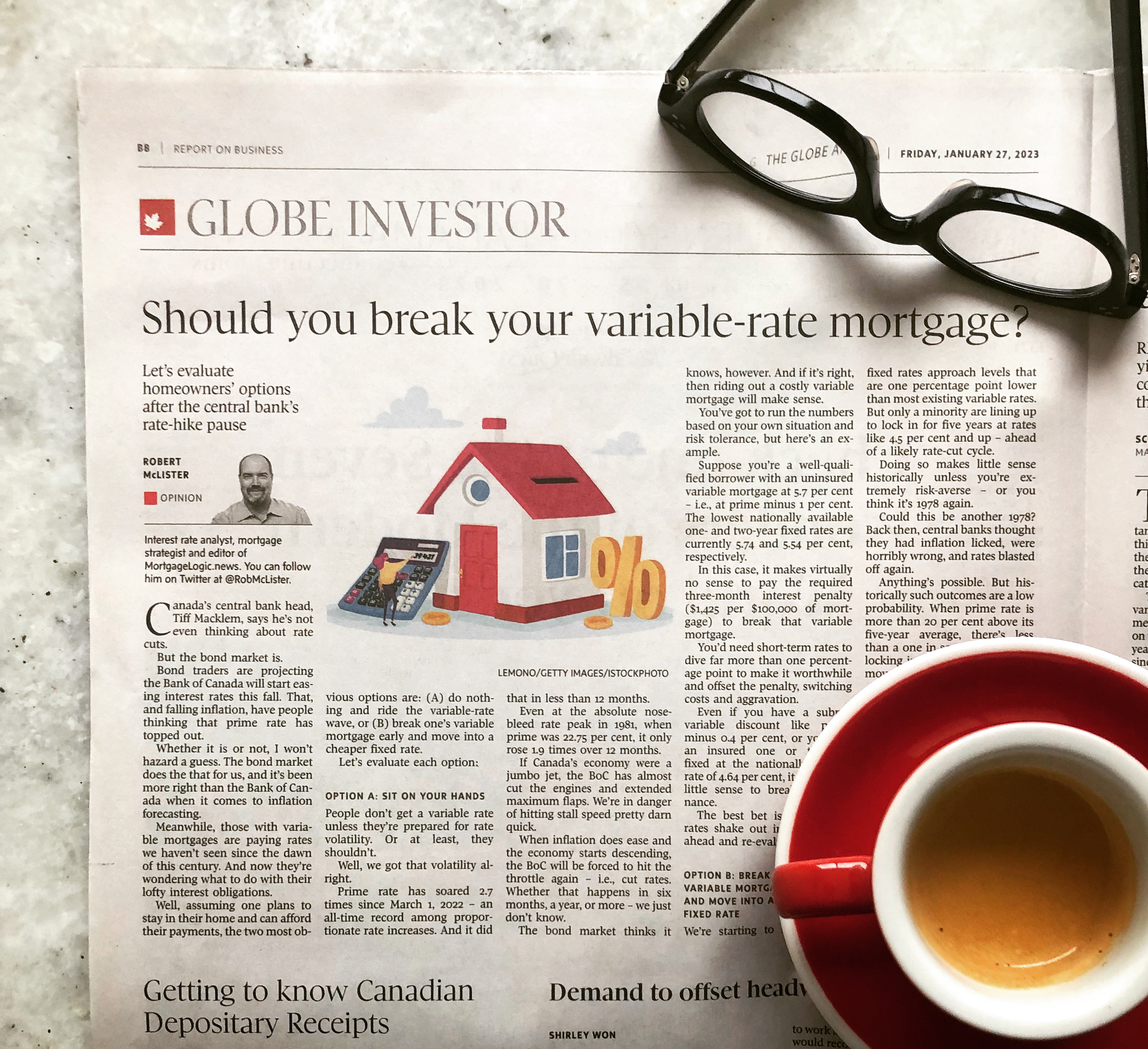 In the Globe & Mail article below dated Jan 27, 2023, Robert McLister (Interest rate analyst, mortgage strategist and editor of MortgageLogic.news) share his thoughts and ideas on this topic. He does focus on two options: A) Sit on your hands & B) Break your variable mortgage early and move into a cheaper fixed rate